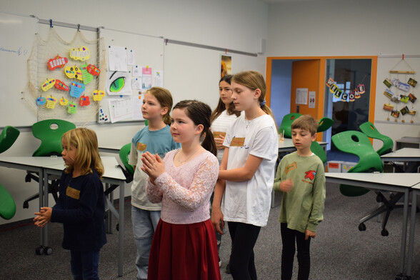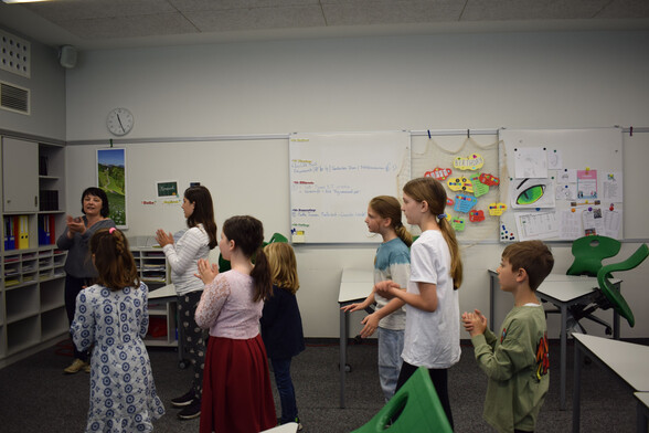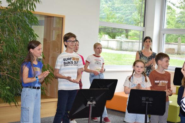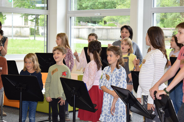 Der Höhepunkt war dann das „Abholkonzert“ um 16 Uhr in der Lernlandschaft der Mittelschule Thüringen, zu dem viele Eltern, Verwandte und Freunde kamen. Die Begeisterung auf beiden Seiten war groß als „Fiddle-Kids-Rag“, „Slow Waltz“, „Bulgar from Odessa“ und „La Cumparsita“ erklangen.