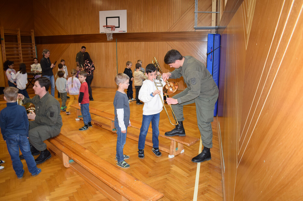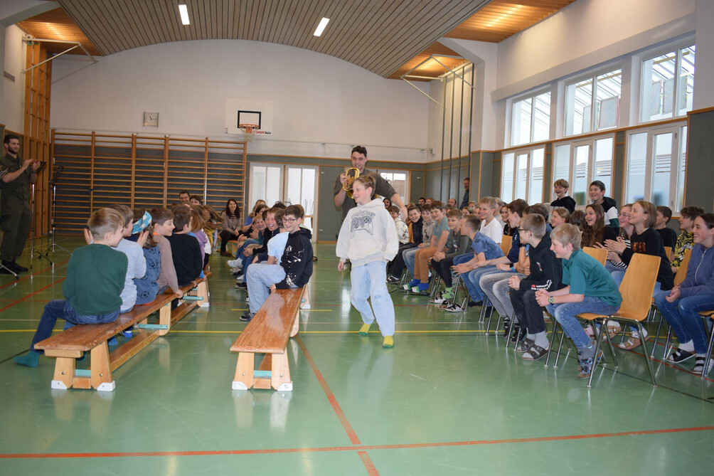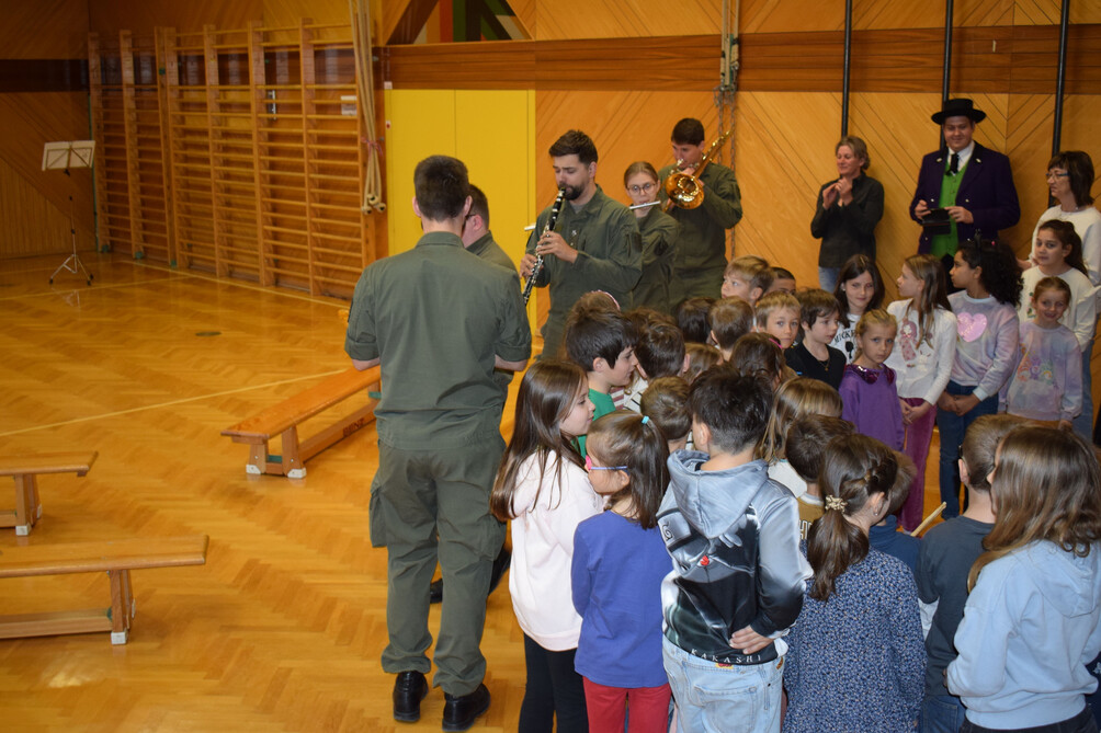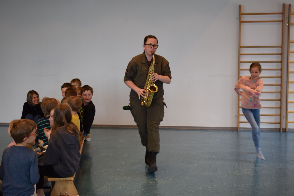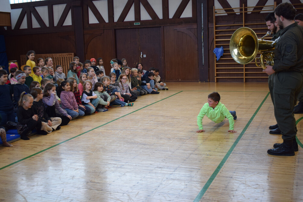 Neun Musikerinnen und Musiker der Militärmusik begeisterten die Schülerinnen und Schüler mit einer unterhaltsamen Vorstellung der Blasinstrumente. Mit viel Humor und einem kurzweiligen Format wurden die verschiedenen Instrumente vorgestellt. Ein besonderes Highlight waren die interaktiven Elemente: Rasende Trompeten und Saxophone traten in einem Wettrennen gegen die Schülerinnen und Schüler an, während eine Kraftprobe mit Liegestützen für jene stattfand, die die Tuba ausprobieren wollten. Selbstverständlich hatten alle Kinder die Gelegenheit, die Instrumente selbst auszuprobieren.