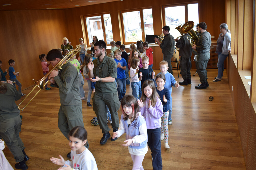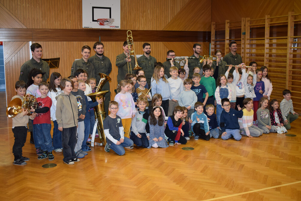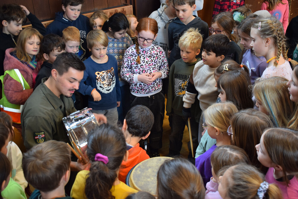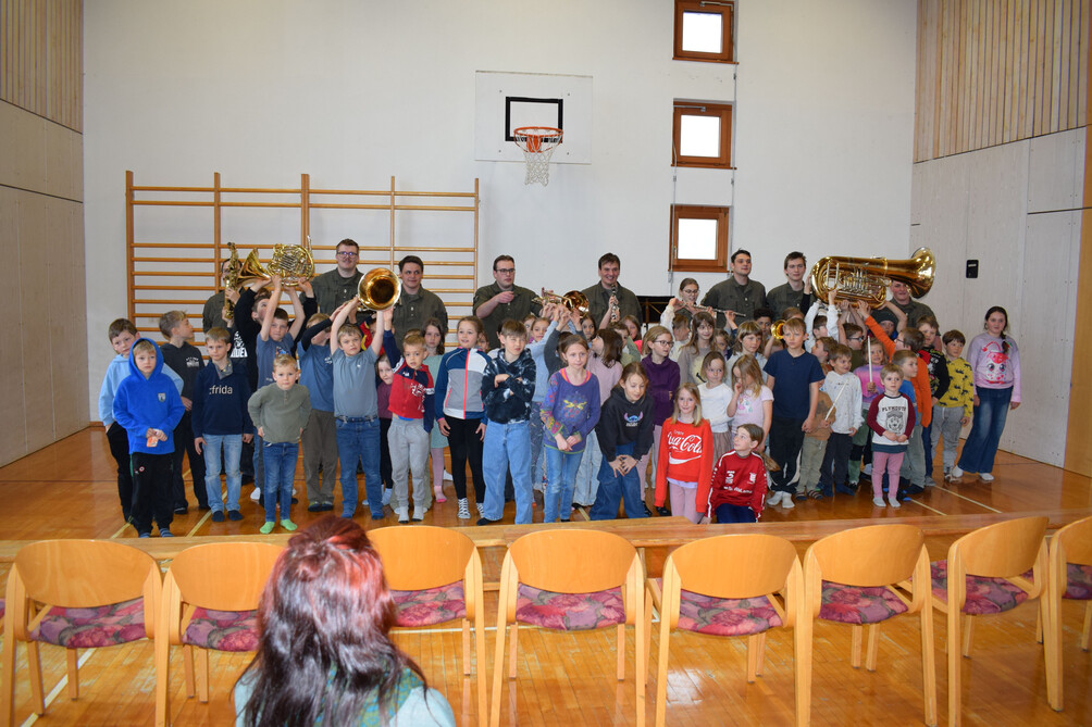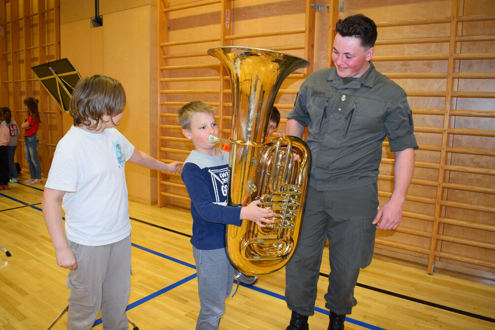 Neun Musikerinnen und Musiker der Militärmusik begeisterten die Schülerinnen und Schüler mit einer unterhaltsamen Vorstellung der Blasinstrumente. Mit viel Humor und einem kurzweiligen Format wurden die verschiedenen Instrumente vorgestellt. Ein besonderes Highlight waren die interaktiven Elemente: Rasende Trompeten und Saxophone traten in einem Wettrennen gegen die Schülerinnen und Schüler an, während eine Kraftprobe mit Liegestützen für jene stattfand, die die Tuba ausprobieren wollten. Selbstverständlich hatten alle Kinder die Gelegenheit, die Instrumente selbst auszuprobieren.