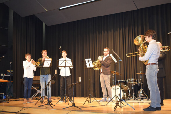 Nachdem die letzten Töne der Hansi-Polka des Bläserensembles verklungen waren, versammelten sich alle Beteiligten noch einmal auf der Bühne des Sunnasaals. Neben der Möglichkeit eines abschließenden Gruppenfotos bot dies den jungen Musikern noch einmal die Gelegenheit, den großen Schlussapplaus der Konzertbesucher entgegenzunehmen.